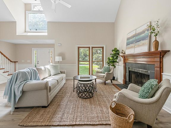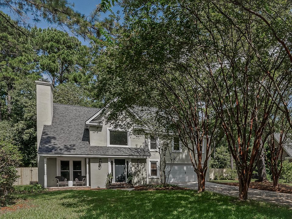 Huge half acre lot on quiet culdesac in Snee Farm! Move-in ready home with great natural light, Two story family room has wood burning fireplace. Formal dining room opens onto a large deck overlooking lush back yard. Eat-in kitchen leads to a sunroom/flex space. Kitchen has stainless appliances, quartz counters, and a single basin sink. Laundry closet, pantry and powder room off the hall to attached garage. All bedrooms are upstairs: master suite with its own office, two guest bedrooms that share a hall bath, plus a loft! Low maintenance laminate flooring in living spaces and new carpet in the bedrooms. Fresh neutral paint and fixtures throughout. Come put the finishing touches on this clean, blank canvas! No flood insurance required. Under termite bond.