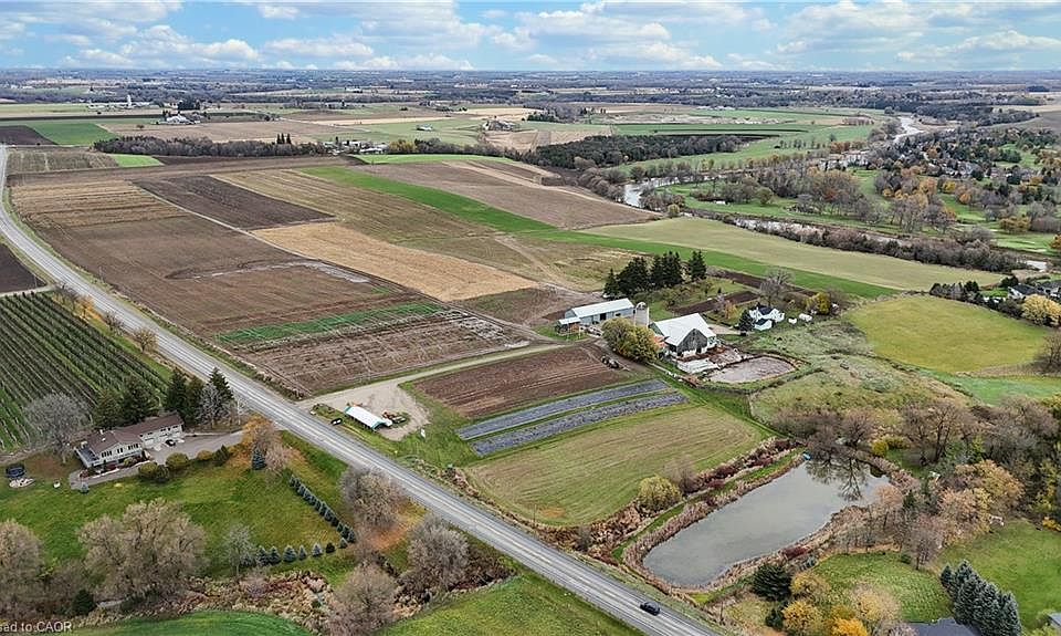 Discover an extraordinary 122.4 acre farm estate nestled along the Grand River, offering a rare blend of agricultural opportunity, natural beauty, and limitless potential. Located just minutes from the City of Waterloo, this property provides the perfect balance: close to every amenity yet immersed in the peace, privacy, and serenity of the countryside. The land unfolds in breathtaking fashion, with approximately 118 workable acres of rich, productive soil currently used for a variety of crops including hay, corn, and produce. Rolling fields meet sweeping river vistas, with a pristine golf course across the river ensuring these one of a kind views remain protected for generations. Governed by the GRCA, the property’s natural character and scenic beauty are preserved and celebrated. Existing structures include a traditional two storey farmhouse with six bedrooms, multiple functional outbuildings, a barn with hayloft, machine shed with insulated shop, tie stalls, horse stalls and pens, and a chicken coop, all reflecting the charm and heritage of a true working farm. This exceptional offering invites endless possibilities. Whether you envision creating your dream estate or a multi family compound, the expansive landscape and location make it an ideal canvas. Its on farm diversified use zoning also opens the door to unique ventures such as ecotourism, agritourism, or a stunning event and wedding venue, all while maintaining the land’s agricultural purpose. A property of this scale and setting is a rare opportunity in Waterloo Region, a place where natural splendor, agricultural legacy, and future potential unite in perfect harmony.