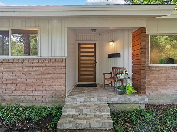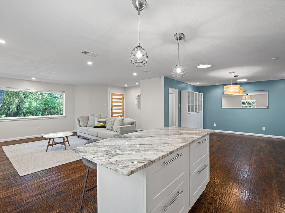 Floor-to-ceiling stone fireplaceBeautifully updated bathroomGleaming hardwood floorsNew granite countertopsCovered patioGenerous dining areaOversized walk-in shower