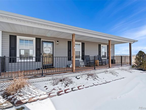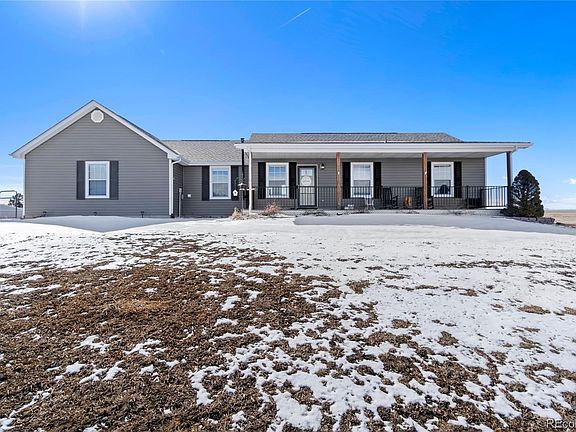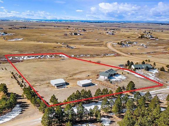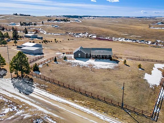 Stunning Ranch-Style home with Panoramic Pikes Peak Views on 8 ACRES and terrific outbuildings all just minutes South of Kiowa and NO HOA. Breathtaking views of Pikes Peak and the entire Front Range from this beautifully updated home. Move-in ready and thoughtfully remodeled, this property is comfort and style. The covered front porch and fenced yard welcome you; this home has excellent curb appeal. Gorgeous kitchen is where you'll want to be; featuring upgraded cabinet doors, quartz countertops, stainless steel appliances—including a brand-new refrigerator and dishwasher—charming farm sink and a large island. Functional and open floorplan on the main level with lots of space for entertaining. Enjoy seamless indoor-outdoor living with direct access from the dining room to the beautiful rear deck. The main level boasts new solid oak hardwood floors, fresh paint throughout, pellet stove and custom Bali shades for privacy and comfort. Two bedrooms and two updated bathrooms, along with a mudroom and laundry area, provide easy one-level living. The basement is a light and bright walkout, complete with a second laundry room, two large bedrooms, and a versatile bonus room easily converted into a fifth bedroom. All 3 bathrooms shine with modern tile showers, updated flooring, and fresh finishes. The home is equipped with a new high-efficiency, cold-climate heat pump and propane furnace for year-round comfort and is generator-ready. The front and back yards are both fenced as well as the acreage. With 8 peaceful acres you also need this 36x36 outbuilding with a workroom, water and potential to be anything you need from a great horse barn to a workshop. Lots of space in the additional detached garage for your vehicles and toys. More storage in the 20x10 shed. Great location and less than a mile off of the pavement; quiet and peaceful country living at its best. With new siding, roof, and gutters installed in 2022, this home truly stands out as a move-in ready ranchette.