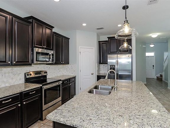 THE TRINITY HOME YOU HAVE BEEN WAITING FOR! A TRUE FIVE BEDROOM HOME WITH PRIMARY SUITE ON THE FIRST FLOOR. FOUR BEDROOMS, 2 FULL BATHS ATTIC SPACE AND LOFT ARE FOUND UPSTAIRS. LOFT WITH NEW HIGH THREAD COUNT, PREMIUM SOFT AND PLUSH CARPET ADDED RECENTLY. THIS RESIDENCE IS NESTLED ON A LOT FEATURING CONSERVATION AND POND VIEWS THROUGH YOUR SCREENED IN PATIO, WITH PLENTY OF ROOM TO ADD THE POOL AND OUTDOOR AREA OF YOUR DREAMS! NICELY ADORNED KITCHEN FEATURES ESPRESSO CABINETRY, GRANITE COUNTERS, STAINLESS APPLIANCES AND ISLAND WITH SEATING. LIVING ROOM WITH NEW WATER AND SCRATCH RESISTANT WOOD LAMINATE FLOORS HAS A GREAT VIEW OF THE BEAUTIFUL CONSERVATION AND POND TO THE REAR OF THE HOME. COVERED AND SCREENED LANAI OFF THE LIVING ROOM OFFERS A GREAT SPACE FOR YOUR MORNING COFFEE OR EVENING WINE. BACKYARD IS ALREADY FULLY FENCED FOR YOUR FOUR LEGGED FRIENDS. HOME HAS A WATER SOFTENER SYSTEM, ADDITIONAL CABINETRY ADDED IN EVERY BATHROOM FOR EXTRA STOAGE. PARK YOUR CARS IN THE LARGE TWO CAR GARAGE. "A" RATED SCHOOLS! NO CDD! VILLAGES OF TRINITY LAKES OFFERS RESIDENTS A COMMUNITY DOG PARK, PLAYGROUND AND TENNIS COURTS!HURRICANE IMPACT WINDOWS AND SHUTTERS, AND NEWLY INSTALLED SOLAR PANELS.