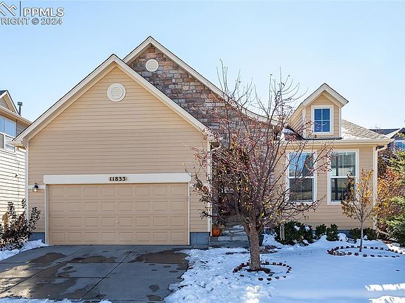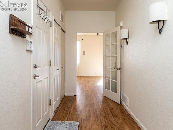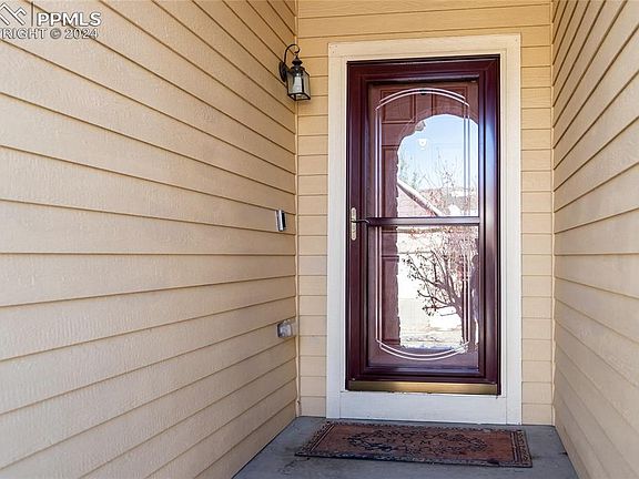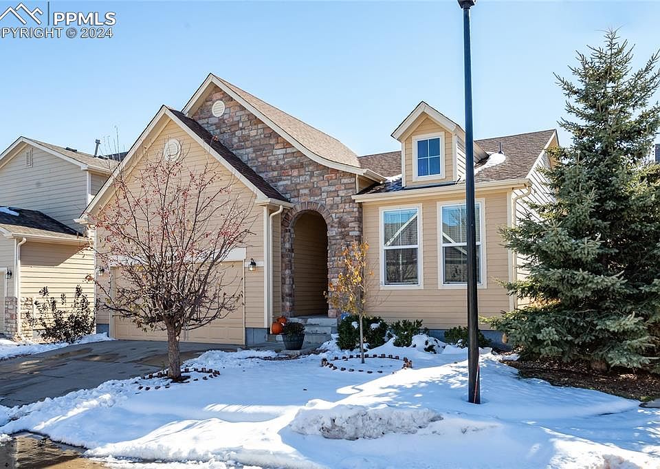 This beautiful home offers rare one level living and mountain and Pikes Peak views ~ Covered entry with stone accents welcomes you in ~ Luxury vinyl flooring extends from entry to hallways, living and dining rooms to the kitchen and the bathrooms ~ Bedrooms have new carpeting and upgraded padding ~ Large foyer has access to the 2 secondary bedrooms, full bathroom, garage and the laundry closet ~ Vaulted ceilings in the great room create an open and airy feel ~ Kitchen offers plenty of cabinet and counter space, tile backsplash and stainless appliances ~ Dining area adjoins the kitchen and walks out to the back yard and the patio ~ Primary suite is away from the secondary bedrooms and has an en-suite bathroom with double sinks, tub/shower and a walk-in closet ~ Wonderful outdoor living area has a large stamped concrete patio with mountain and Pikes Peak views, tranquil waterfall/pond feature and great, mature landscaping ~ Garage is insulated, dry walled and painted and offers epoxied flooring, mini split unit providing heat and air conditioning, hot and cold water connections, large dog bathing/grooming station and loft storage space ~ This well cared for home offers newer vinyl windows, newer washer and dryer, surround sound speakers in the living room, air conditioning and some smart lighting features ~ Convenient location offers easy access to the shopping, dining, military installations, schools and parks ~ Metro district fee allows access to the 2 community centers with many amenities and services!