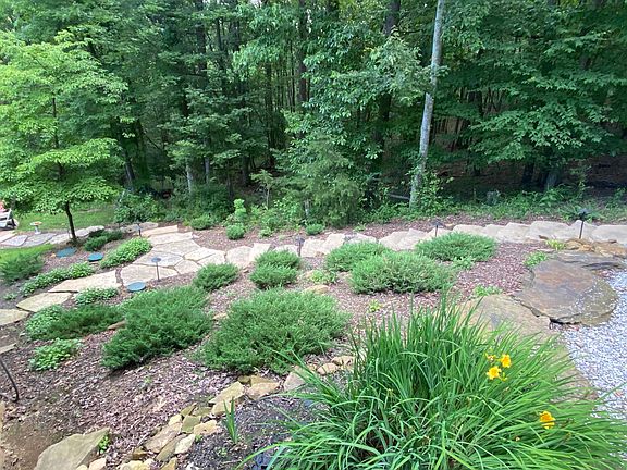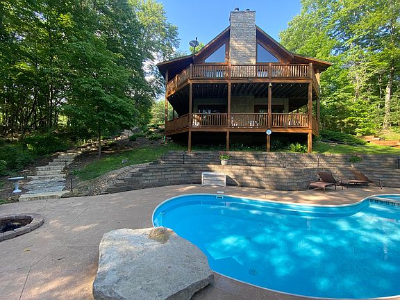 Premium log lodge, 3+ acres with scenic ravine, seasonal stream & deep woods. Nestled into a secluded upscale cul-de-sac neighborhood. Pristine condition in & out. Unique pro-installed heated pool & tub combo, plus neat pool shed & equipment...robotic cleaner included. Standout recent exterior re-stain of upscale large dovetail logs, 2000+ sqft of wraparound decking & double walkouts main & LL. Exceptional land & stone scaping w/striking newer steps. Spacious main & upper BR suites, captivating loft, inviting finished lower with log-burning FP, wet bar, plus 3rd full bath. Grand great room with floor-to-ceiling stone FP with gas logs, large dining area, and well-equipped kitchen with wide breakfast bar. Lots of windows, plus multiple ceiling fans & fixtures, so nicely complement dramatic cathedral ceilings and classic wrought iron brackets..