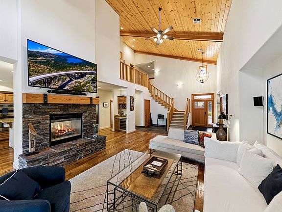 The main level offers a wonderful social area with 20 foot ceilings, hand-scraped hardwood floors and tile, a large fireplace, 86 inch LED television with surround sound and an open concept living-room kitchen area.