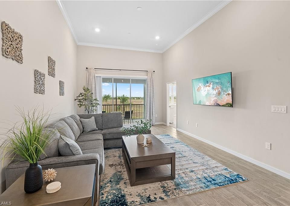 Discover this nearly new, beautifully appointed veranda located in the sought after Esplanade Lake club. This two bedroom plus den boasts modern finishes throughout, including elegant quartz countertops, stainless steel appliances, a decorative tile backsplash, and stylish wood plank ceramic tile flooring. The open-concept design is enhanced by crown molding and an elegant designer lighting package, creating an inviting and sophisticated atmosphere. Enjoy serene preserve views from the back lanai, offering peaceful relaxation without noise or distractions. Esplanade Lake Club offers an unparalleled lifestyle with resort style amenities, including a sparkling pool, lakeside beach, on-site restaurant, fitness center, spa, cafe, bocce and pickleball courts, tennis courts and a dog park. Conveniently located near the airport, shopping, dining, I-75, and Gulf Coast Town Center, this home truely offers the best of Florida Living!