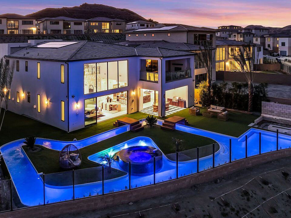 UNIQUE OPPORTUNITY! BEST VIEWS IN WESTCLIFFE! LAZY RIVER POOL! Welcome to this exceptional 5-bedroom, 6-bath luxury estate, where modern sophistication meets unparalleled comfort. Situated in the coveted Westcliffe at Porter Ranch, this home offers breathtaking panoramic views of the city, mountains, and a beautiful park, creating the perfect backdrop for everyday living. Step inside to experience a grand open-concept design, highlighted by soaring 22-foot ceilings and expansive oversized windows that flood the home with natural light while framing spectacular vistas. The interior is meticulously upgraded with premium finishes, including designer light fixtures, custom cabinetry, and state-of-the-art technology. At the heart of the home, an oversized kitchen island serves as both a focal point and functional space, perfect for entertaining guests or enjoying quiet family meals. The chef-inspired kitchen boasts top-of-the-line appliances, sleek countertops, and ample storage, making it an absolute dream for cooking enthusiasts. The luxurious primary suite offers a private retreat with stunning city and mountain views, a cozy patio with a fireplace, large walk-in closet, and spacious bathroom with soaking tub. The spacious bedrooms are each thoughtfully designed to provide maximum comfort and privacy, with generous closet space and easy access to upgraded bathrooms. Enjoy a range of world-class amenities right at home, including a resort-style backyard featuring a lazy river pool, perfect for relaxing or entertaining on hot summer days. A large side yard adds even more space for outdoor living or sports court. Indulge in cinematic experiences in your very own private theater room. Stay fit in the fully equipped gym and work from home in the elegant office space. The home is equipped with cutting-edge smart home features, interior and exterior speakers, and three electric car charging stations. Solar panels and a whole-home water filtration system to add to its sustainable, eco-friendly appeal. Additional features include expansive walk-in closets, upgraded light fixtures throughout, and a thoughtful floor plan that ensures ample space for both intimate family living and grand entertaining. Don't miss your opportunity to own this one-of-a-kind property. Schedule a private tour today and experience all that this extraordinary home has to offer.