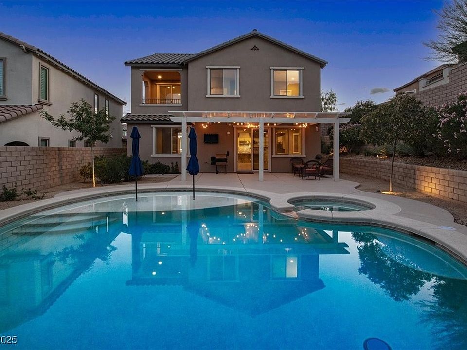 Welcome to luxury! This stunning home is situated behind the gates of Saratoga in Summerlin & features 4 bedroom, 3.5 bath w/ a dual primary bedroom option, sits on an oversized lot & has been upgraded to perfection! Upon entering from the private courtyard, you'll find an open concept w/ high ceilings, tons of natural light, freshly painted interior, White Oak LVP flooring & shutters throughout the entire home, upgraded lighting fixtures & custom finishing touches. The chefs kitchen features beautiful quartz countertops, stainless steel appliances W/ double ovens, large center island & a walkin pantry. First-floor primary suite offers privacy & style w/ walk-in closet & private bath w/ dual vanities including Halo LED Mirrors, separate tub & shower combo. Spacious loft offers the perfect flex space w/ a covered patio & mountain views. The backyard oasis is complete w/ a heated pool & spa, wet deck, lighting & patio cover perfect for summer gatherings! Dont wait, call this home today!