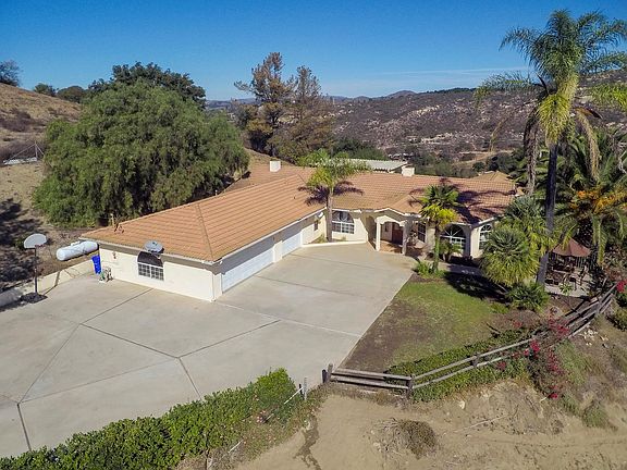 Incredible 3 bedroom, 2 bath 2296 SF horse property with panoramic views of the entire valley and Palomar Mountain. Home sits on the end of a very private and quiet cul-de-sac. Property is completely fenced, with V Wire fencing, and has an FCP Horse barn, with 1 12X12 stall, a 12 X 12 Tack room, and 1 covered stall. There is a separate Wash rack. The home itself has panoramic views from every room. There is a formal dining room, and large rock fireplaces grace both the Living Room and Master Bedroom.