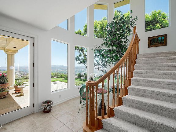 With jaw dropping panoramic views of the picturesque Santa Rosa Valley clear to the Channel Islands, this 5 Bd 5 Ba, 5288 sq ft gated custom estate sits high above the rest offering a truly elevated lifestyle. The home has incredible curb appeal. The moment you arrive, the home radiates sophistication, emotion, and timeless beauty. Enter through grand stone arches to doors adorned with leaded glass, and step into a world of soaring ceilings, rich textures, and natural light streaming through towering windows. The entry hall stuns with hand-laid beveled limestone floors and dazzling crystal chandeliers, setting the tone for what lies beyond. A classic center-hall floorplan guides you toward the living room with fireplace to the left, and a refined dining room with adjoining butler's pantry to the right. At the heart of the home, the gourmet island kitchen is well appointed, with built-in refrigerator, breakfast nook, abundant storage. Open to the kitchen, the family room focus is the beautiful views out windows on either side of a hand-carved stone fireplace mantle. This home incorporates thoughtful craftsmanship, from intricate moldings to oversized picture windows designed to capture the stunning views. A bedroom and full bath ensuite is also located downstairs as well as a well-appointed powder room.Upstairs, there are three secondary bedrooms. The primary bedroom is a grand suite with sitting area, and an enormous private deck with dramatic precast balustrades with direct access to the pool below. The primary bath has large dual closets, spacious shower, closed commode w/bidet, spa-inspired jetted tub. In addition, there is a spacious bonus room/library/office with fireplace and built-in bookcases.The grounds feel like a private resort. Pool, spa, and sparkling waterfalls are perfectly positioned to appreciate the view. Enjoy the contemplation point with the firepit lounge, gather at the custom-built BBQ and bar, H/C shower, lawns, scenic trails on property leading to viewing gazebo, fruit trees, & vegetable garden.Don't miss this gorgeous estate offering privacy, space, and serenity with amenities including a four-car garage, horse zoned, multiple entertaining terraces. Located in the scenic Santa Rosa Valley, temperate climate, close to 110 & 118 freeways, close to shopping, beaches & miles of trails. Award winning schools. No H.O.A! And, That View! Not just a home, it is an experience, a retreat, a statement. Come live it all.__________