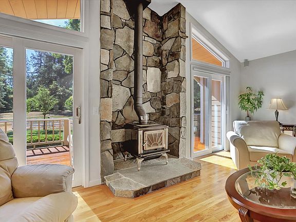 Discover this enchanting country estate offering 3 bedrooms, 2.5 baths, and refined comfort on 3 picturesque acres. The park-like setting is serene and private with sweeping views from every window and a seasonal pond nourished by 1 miner's inch of irrigation water creating a lush landscape for gardens, lawns, or hobby farming. Enjoy the patio under the pergola for breakfast or entertaining, surrounded by natural beauty. Inside, a contemporary light-filled interior showcases soaring cathedral ceilings and dramatic walls of windows that frame the peaceful surroundings. The inviting living room is both elegant and welcoming, with direct access to the back deck for seamless indoor-outdoor livingperfect for gatherings or quiet evenings by the view. The primary suite also opens to the back deck and yard, while a guest bedroom or office connects to the front partial wrap-around porch. Thoughtful touches such as motion-sensor lighting add convenience and peace of mind. Just 5 minutes to shopping and dining, this estate offers the ideal balance of modern comfort, natural beauty, and country serenity.
