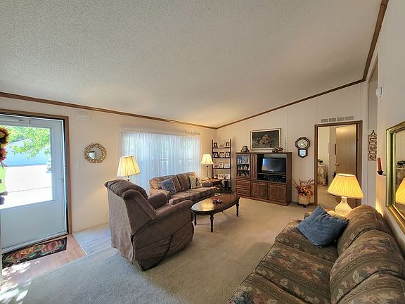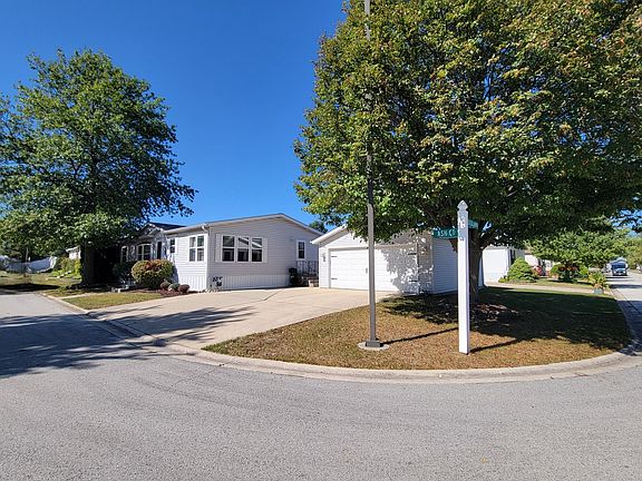 Beautiful trees and corner lot welcome you to this charming mobile home in Manteno's Oak Ridge 55+ Community. Home features 3 bedrooms, 2 full bathrooms (including a master bath), huge living space, large eat in kitchen with pantry, dedicated laundry room and 2 car garage. Vaulted ceilings, skylights and plenty of windows make this home so inviting. Schedule your tour today. [Golf Cart friendly. Furnance/AC about 5yrs old. Roof believed to be done 2016-2019. Fridge/Washer/Dryer about 2yrs old.]