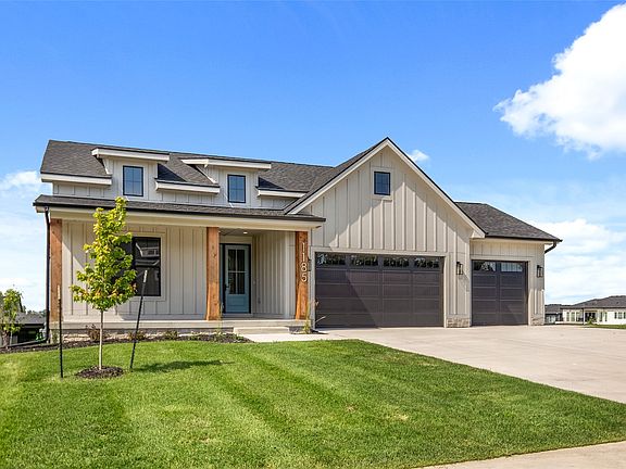 This well-designed Farmhouse style walk-out ranch located in Willow Hills, Grimes is built by Frampton Homes. The open-concept layout is filled with natural light from large windows, offering expansive views. A vaulted ceiling, custom beam accents, and a floor-to-ceiling stone fireplace create a warm and elevated living space. The kitchen features a large island, soft-close cabinetry, quartz countertops, stainless steel appliances, and a hidden walk-in pantry with custom barn doors. This home offers nearly 3,000 sq ft of finished space, including 4 bedrooms and 3 bathrooms. A spacious semi-formal dining area can also serve as a family room or home office. The primary suite and second bedroom or office, along with a full bath, are located on the main level. The en suite includes tray ceilings, dual walk-in closets, and a luxurious bath with dual vanities, a soaking tub, and tiled shower. The covered composite deck with Westbury handrails is perfect for enjoying breathtaking sunsets from the West. A stone retaining wall creates usable green space in the backyard and is appealing to the eye. The 840 sq ft 3-car garage includes 8-foot insulated doors and a side walk-in door. Additional highlights: custom drop zone, first-floor laundry, full irrigation, passive radon system, space for a 5th non-conforming room in the lower level, and dual-zone HVAC. Located in Johnston Schools, with open enrollment available to DCG. OCTOBER PROMOTION available-call listing agent for more details!