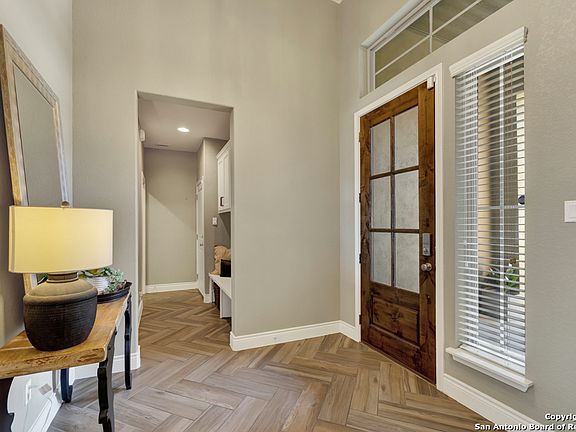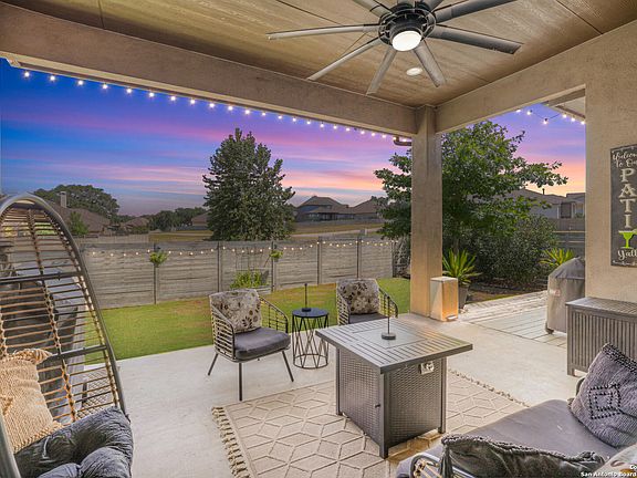 This stunning Monticello Custom Home is set on a desirable corner lot in the prestigious Vintage Oaks community. Designed with both elegance and comfort in mind, the home offers a bright and open floor plan filled with natural light, soaring ceilings, a mock fireplace, and designer finishes throughout. The layout includes a formal dining room, a private study, and a spacious game room, creating flexible spaces ideal for entertaining or everyday living. The chef's kitchen combines style and functionality with a built-in oven and microwave, an electric cooktop, and abundant cabinetry. Just steps away, the primary suite provides a serene retreat with bay windows, dual closets, and a spa-inspired bathroom featuring a garden tub, split vanities, and an oversized walk-in shower. With four bedrooms and three and a half baths, the home offers ample space to accommodate family and guests alike. Outside, a large covered patio invites you to relax with a cocktail while enjoying peaceful Hill Country sunsets. Beyond the property, residents of Vintage Oaks enjoy an exceptional lifestyle with access to premier amenities, including a state-of-the-art fitness center, four pools, a lazy river, multiple courts for pickleball, tennis, volleyball, and basketball, as well as soccer and baseball fields, playgrounds, a clubhouse, and miles of hiking and biking trails. Surrounded by mature trees and native wildlife, this property offers the perfect blend of luxury living and natural beauty. Don't miss the opportunity to own a piece of paradise in one of New Braunfels' most sought-after communities.