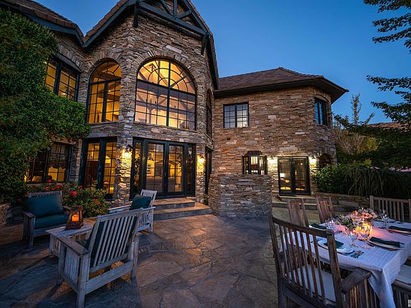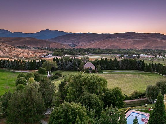 Nestled on a lush 9.77 acre estate in south suburban Reno, this unique property is framed by over 240 mature trees, planted over a span of 25 years, offering tranquility and privacy. The English-style ledgestone main residence exudes timeless elegance, complemented by a charming guest house. Both homes feature their own wells and septic systems. A beautiful seasonal water feature, the Big Ditch canal, meanders through the property under four stone bridges delivering surface water for pasture irrigation., The fully fenced estate offers peaceful privacy with a gated main entrance and a secondary back gate. Garage space accommodates five cars between the main house’s three-car garage and the guest house’s two-car garage. Inside, quartzite stone floors add elegance to the spacious living areas. Outdoors, multiple patios framed by roses and mature trees provide serene spots to unwind. A new built-in BBQ near the expansive pool and spa area creates an inviting space for entertaining.