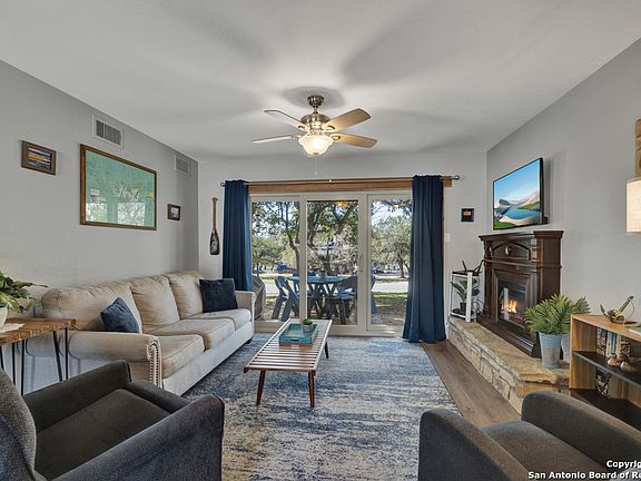 This Canyon Lake Condo is a fantastic retreat set on a beautiful oak-covered property, offering serene surroundings with amenities such as a swimming pool, picnic tables and barbeque pits.  The two-bedroom, two bath split floor plan includes a cozy living room with a fireplace and TV, perfect for relaxing.  This is a downstairs corner unit with no stairs. The owners retreat features a king-sized bed and a private en-suite bath for ultimate comfort and privacy.  Great bedroom closet with styling barn door and large bath vanity for your personal belongings. The kitchen is bright and light with all updated white cabinets, appliances, backsplash and a farmhouse sink.  Butcher block countertops add a nice touch and contrast along with a bar area.  Newer  windows and sliding glass doors lead to a double patio where you can enjoy the peaceful outdoors and wildlife.  The condo has been refreshed with vinyl flooring, walk in shower, whitewashed accent walls and natural wood touch, creating a calming atmosphere.  Fully furnished, this unit is currently being operated as an overnight rental, offering the opportunity for income when not in use.  It's the perfect mix of relaxation and investment potential in a sought-after area.  Forgot to mention updated A/C and water heater. Located close to grocery stores and restaurants.  You will love this beauty!