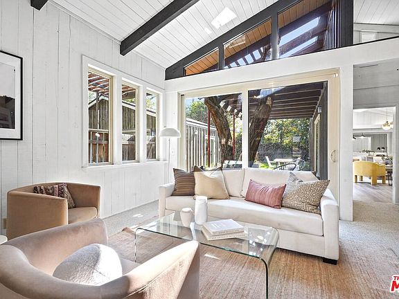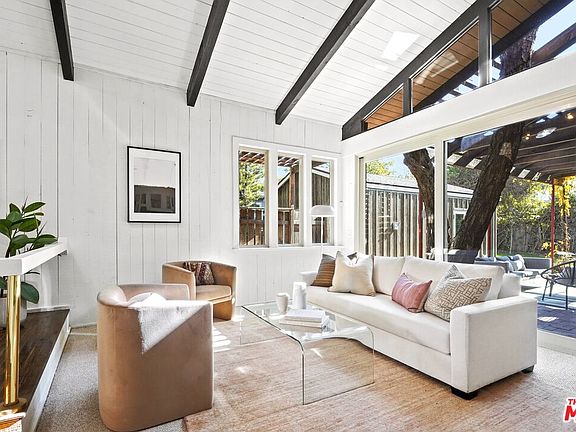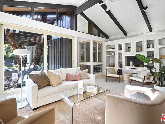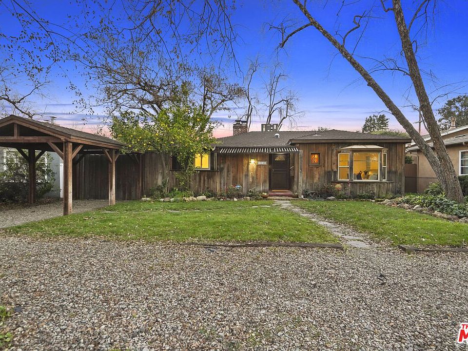 For those searching for that unique property with vision toward the life well-lived, a postmodern architectural awaits. Hip, relaxed, refined with a stylistic identity all its own crowning an expansive 8,100 square foot lot in the most sought after pocket in Valley Village. Alluding to the style and design of an Aspen mountain chalet, the property is the epitome of peaceful seclusion residing in divine harmony with its organic environment of towering trees and verdant greenery. Massive walls of glass beautifully bridge the aesthetic divide between structure and nature, bringing the outdoors in and suffusing the space in an abundance of natural light. Vaulted beamed ceilings soar above a floor plan that flows with ease designed for contemporary living and entertaining. The post and beam covered brick patio and expansive back lawn epitomize the Southern California lifestyle of endless al fresco leisure and outdoor entertaining. Highlights include freshly painted interiors, skylit kitchen with breakfast bar, a secret hidden bonus room, and a newly built 2-car detached garage with built-in storage and glass doors that easily doubles as a multi-use flex space. Three bedrooms including a primary suite with cozy fireplace round out the comfortable accommodations. Located in an idyllic, picturesque tree lined street just moments from the award winning Colfax Charter School District, beloved Valley Village Park, Disney, Warner Bros. CBS, NBC and Universal Studios and the famed NoHo Arts District. This is the place where you want to live. Welcome!