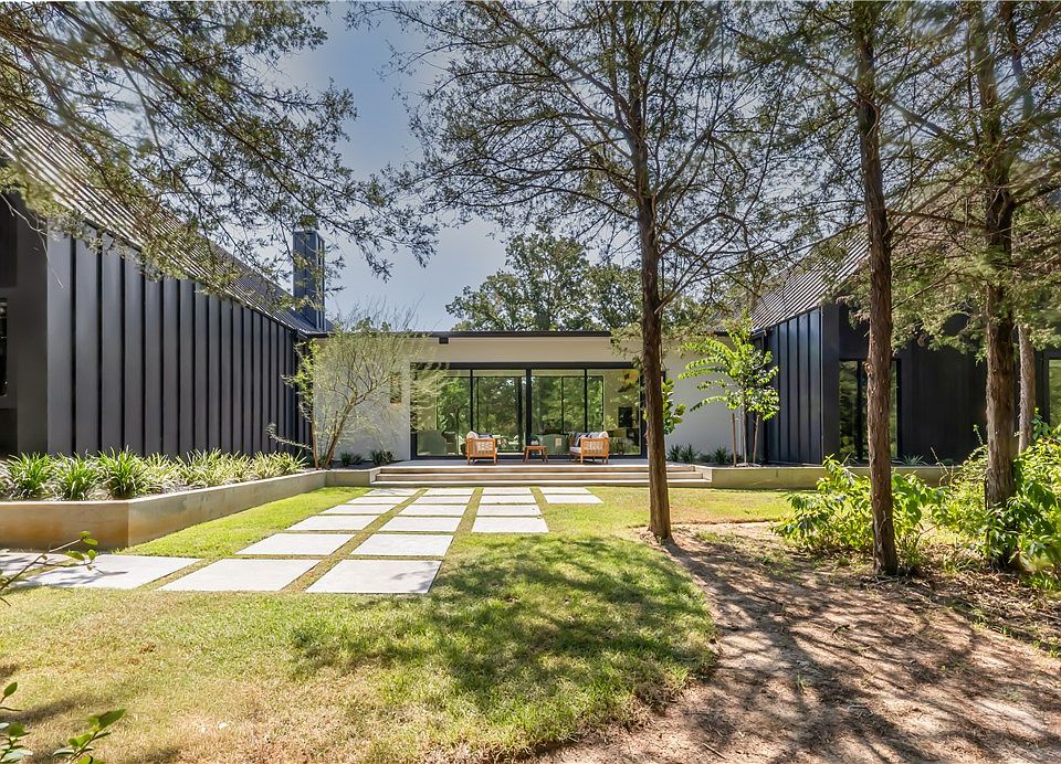 STUNNING ARCHITECTURAL RETREAT ON 12 ACRES! No expense has been spared in this never-lived-in, one-of-a-kind 12-acre retreat nestled among rolling, tree-covered hills. This architectural masterpiece features a modern exterior with Brazilian charred cedar siding, a 22-gauge metal roof and wall panels, and separate His and Hers garages with epoxy flooring. Inside, massive Western Window sliding doors flood the open living, dining, and kitchen areas with natural light. The living room centers around a floor-to-ceiling Isokern wood-burning fireplace, while the show-stopping kitchen boasts a beveled-waterfall island, exclusive Poggenpohl cabinetry, a 48" Cafe range, custom matte black vent hood, open shelving with lighting, and custom wood accents. The powder bath stuns with designer wallpaper, rare blue quartz counters, and backlit mirrors. The luxurious primary suite features motorized shades, designer wallpaper, a coffee bar, and a vast walk-in closet. Its resort-style bath offers Poggenpohl vanities, a large walk-in shower, and a massive standalone tub with a ceiling-mounted filler. A private screened-in porch includes a ceiling heater and backyard access. The split floorplan offers two more spacious bedrooms, designer baths, space for a home gym, a fully insulated quiet room or study, and dual laundry rooms. A whole-home audio system makes this home perfect for entertaining. This is Colorado-style living in Texas - Truly a once in a lifetime property!
