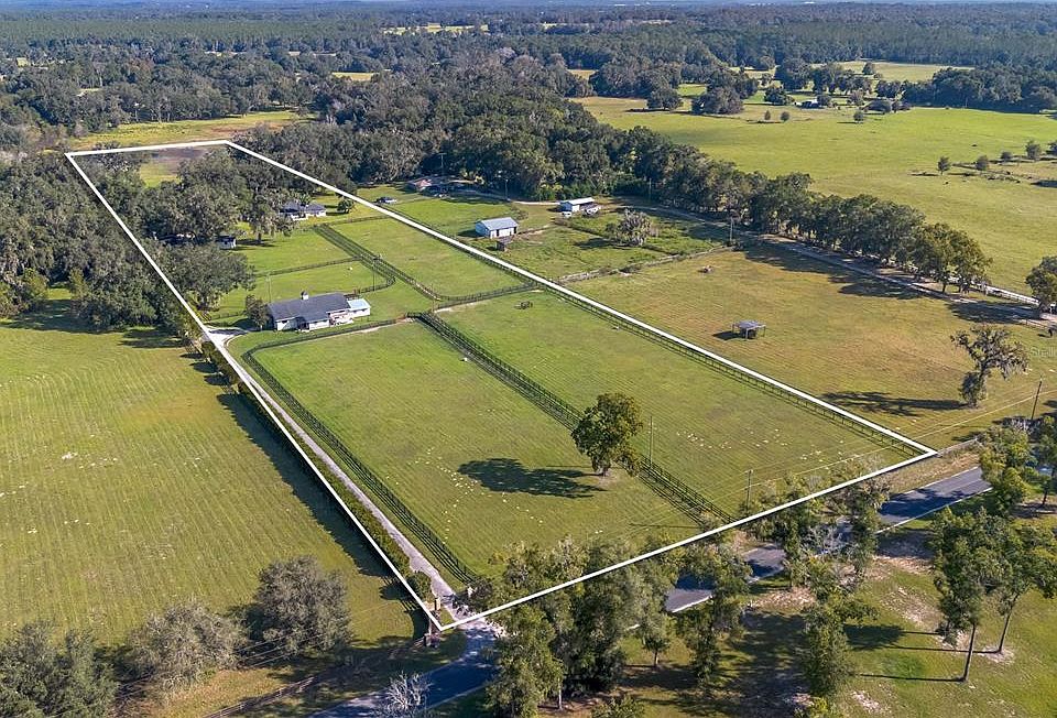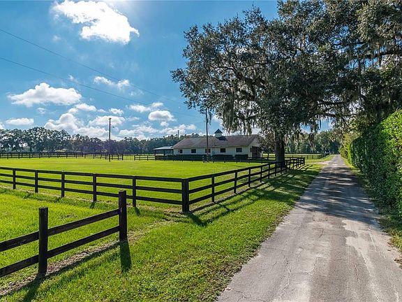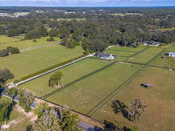 Situated amongst large beautiful horse farms in Marion County’s vibrant Horse Country just 4 miles from the World Equestrian Center (WEC), this 12.71-acre farm is a real gem. Beyond a gated entry and down a paved driveway, the property offers a lovely center aisle barn, a total of 5 paddocks with board fencing and nice, flat areas. The 9-stall concrete block center-aisle barn includes wash stalls/grooming stalls, an equipment and work area, as well as a new tack room / riders lounge with a full bath and laundry area. Near the main home, a newly constructed 2-stall concrete block barn includes its own wash area and tack/feed room. A 30-amp RV hookup with septic connection adds further convenience for guests or seasonal rental income. Towards the back of the property is a thoughtfully updated 3-bedroom, 2-bath home built in 1985. Spanning just under 3,000 sqft, the home features a split-bedroom floor plan, tall ceilings, and engineered hardwood flooring and tile in the kitchen and baths. The spacious great room features a lovely brick accent wall with fireplace, large windows, cathedral ceilings, and an inviting formal dining area. Directly open to the great room, the kitchen is well equipped for those who enjoy cooking with stainless steel appliances, extensive cabinet storage, quartz countertops, and a large center island with breakfast bar. An additional breakfast nook with built-in shelving and window seat also provides stunning views of the surrounding farm and pool, perfect for a quiet morning coffee or less formal meals. Each bedroom is oversized and inviting, though the primary suite is the true stand-out with an extra large layout, walk-in closet, and private en-suite bathroom with an overflow tub and dual vanities. Additional features of note include a dedicated office for those who work from home and a spacious garage. At the back of the home is a large screen-enclosed pool deck with recently resurfaced in-ground pool and spa, a covered area for seating, and an adjacent open-air covered deck. An additional climate-controlled flex building with covered carport is also established on the property, ready to serve as a gym, workshop, studio, or office as desired. With its seamless blend of updated residential space and professional-grade equestrian infrastructure, combined with the abundant beautiful live oaks, this turnkey property offers a rare opportunity to train, ride, and live in comfort!