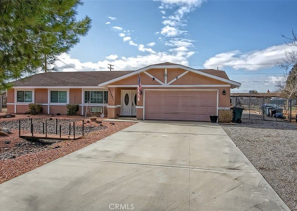 Centrally located Apple Valley Ranch Style Home with a very open concept has 1868 sq ft with 3 bedrooms and 2 bathrooms in the main home and a 1 bedroom, 1 bathroom permitted Guest Home with a kitchen. Spacious double door entry. Formal living room, family room with a wood burning insert fireplace to heat the whole house. Expansive dining area and kitchen with stainless steel appliances. Living, Dining and kitchen rooms only separated by pony walls. All bedrooms are perfect size with space utilized wisely. Separate indoor laundry room off the 2 car attached garage. Low maintenance rock scape in the front and back yards, drive gate, completely fenced and cross fenced, additional parking, minutes from schools, shopping, restaurants at the Apple Valley Jess Ranch Marketplace.