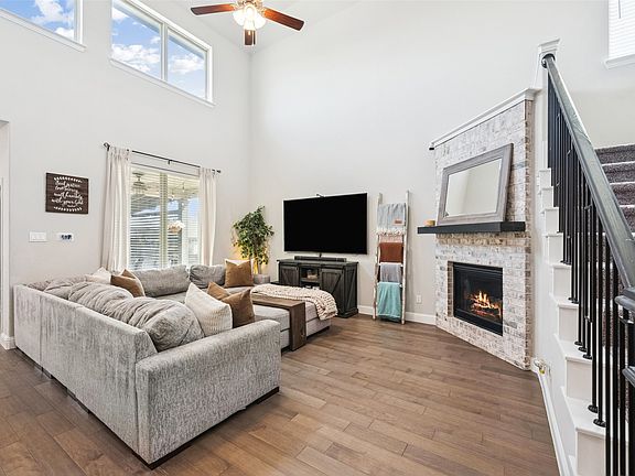 The primary suite offers a private retreat with a spa-like ensuite outfitted with dual sinks and a massive walk-in shower. Upstairs, a versatile loft and two secondary bedrooms share a well-appointed bathroom, while the dedicated media room has been customized for the ultimate theater experience with tiered seating. Additional thoughtful details include a main-floor office, oversized storage, and whole-home audio, allowing each room to enjoy music independently. Outdoor living is just as impressive. The covered patio creates an inviting space for relaxation, while the backyard features a golf practice area and green space for recreation. Solar panels further enhance the home’s energy efficiency, helping to reduce utility costs and environmental impact. Living in Wellington means access to incredible neighborhood amenities, including a resort-style pool, splash pad, clubhouse, fitness center, playgrounds, sports courts, and trails. With its blend of modern technology, stylish upgrades, solar-powered efficiency, and community conveniences, this is a one-of-a-kind home designed for comfort, entertainment, and everyday enjoyment.