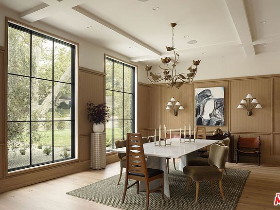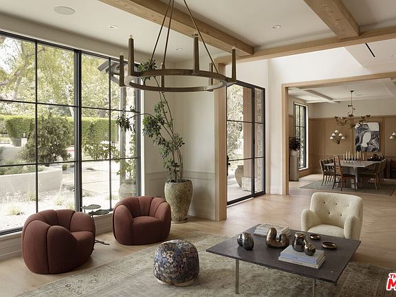 Mediterranean charm meets refined European elegance in this brand-new construction, 6-bedroom plus office, 9-bath, 10,100 sq ft residence set on a 14,143 sq ft corner lot. Heritage olive trees, vintage ceramic pots, and lush Mediterranean-inspired gardens frame a tumbled natural stone facade accented with fire-rated Acre siding that blends durability with timeless appeal. Step inside to discover interiors that celebrate artisanal craftsmanship and understated luxury. Solid white oak floors flow seamlessly throughout, complemented by intricate custom wood moldings and millwork that bring depth and warmth to every room. A curated selection of handpicked designer finishes lends effortless sophistication. The chef's kitchen features custom marble countertops sourced and designed with inspiration from classic French ateliers, paired with European checkered flooring that continues into the hidden butler's pantry. Formal living and dining rooms, a family room, and multiple entertaining spaces connect effortlessly to the resort-style backyard. Outdoors, a shimmering pool and spa with checkered stone waterline tiles set the tone for a luxurious living experience. An outdoor kitchen featuring an Alfresco pizza oven, a sculptural fire pit, and multiple terraces with panoramic canyon views extends the living space beyond the interior. The primary suite offers a tranquil escape beneath vaulted white oak ceilings, complete with dual walk-in closets, a private morning bar, and a spa-like bath featuring Waterworks fixtures and a Hydro Systems soaking tub . Additional amenities include a moody speakeasy bar, a 1,657-bottle refrigerated wine room, a state-of-the-art theater, and a wellness wing with a gym, cold plunge, sauna, steam room, and private massage room.