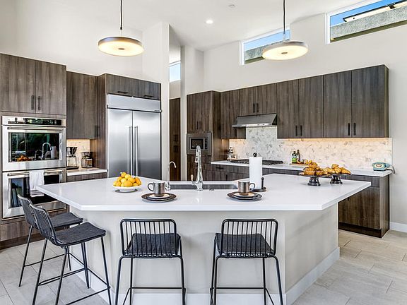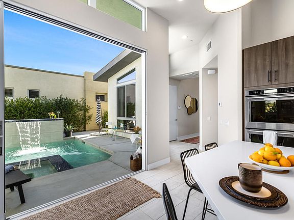 Newly built in 2020, move-in ready luxe one-level home in Palm Springs! Located in a coveted neighborhood with an award-winning golf course, this 3BR/2.5BA highly-upgraded former model offers mountain views, gorgeous modern architecture, stunning desert hardscaping, and a chic mid-century exterior. Exceptionally fashioned with an upscale vibe, the interior features high ceilings, stylish tile flooring, a crisp color palette, an organically flowing floorplan, expansive sliding doors on two sides that bring in incredible natural light, dazzling clerestory windows, and a spacious living room with a gas fireplace. The open concept gourmet kitchen impresses with stainless-steel KitchenAid appliances, designer cabinetry, Carrara marble backsplash, quartz countertops, gas range, double wall ovens, breakfast bar, premium finishes, a dining area, and gorgeous views of the outdoor poolside oasis with waterfall. Equipped with two outdoor spaces, you can relax in the jacuzzi and sparkling swimming pool, or opt to dine alfresco beneath the covered patio. Discover tranquility in the oversized primary bedroom, which has a deep walk-in closet and an ensuite w/a soaking tub, separate shower, and dual-sink vanity. Other features: owned solar, 2-car garage w/EV charger, laundry room w/sink, J-and-J bath, water softener and filtration system, security system, multi-zone HVAC and more. Excellent for income producing or primary residence. Highly-desirable gated community with very low HOA!