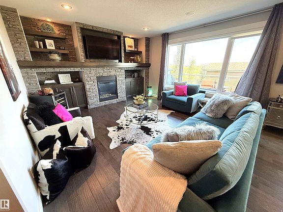 Former Rococo show home; beautiful 2014-built 2-storey with attached triple garage (30Wx26L, heated, AC, water, retractable screen door, high flow exhaust fan) backing onto green space in Genesis On The Lakes. This 2,435 sq ft (plus full basement) home features central AC, in floor heat, hardwood flooring and a fantastic open layout. On the main: bright front office, 2-pc powder room, living room w/ gas fireplace & built-in shelving, dining room with deck access and gourmet kitchen with eat-up island, granite counters, floor-to-ceiling cabinets and walk-through pantry to mudroom. Upstairs: top floor laundry, bonus room, 2 full bathrooms and 3 bedrooms including owner’s suite with luxurious 5-pc ensuite & walk-in closet. Fully finished basement with 2 additional bedrooms, 3-pc bathroom & family room. Fenced, landscaped yard with deck, storage shed and exterior gemstone lighting. Fantastic location near pond, walking trails and easy access to Highways 779 & 628. Must see!
