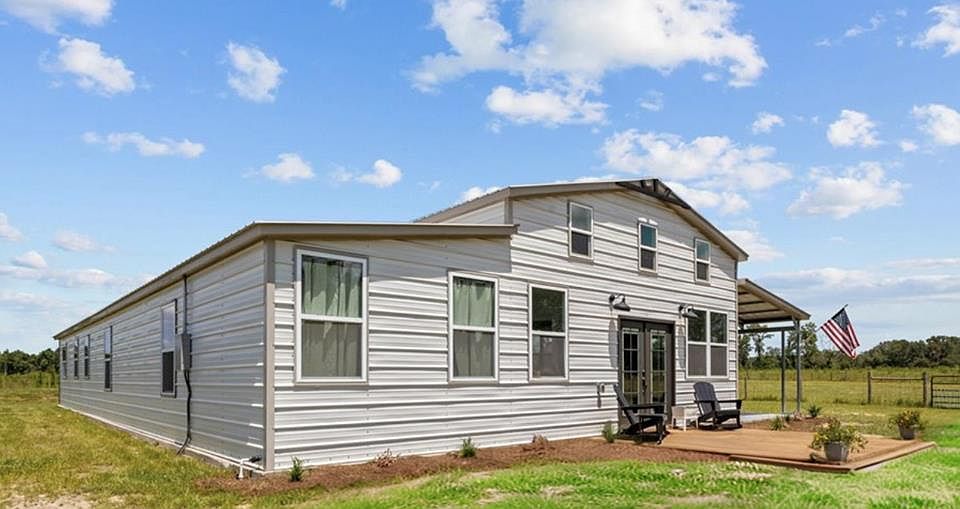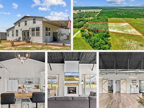 This five-bedroom, two-bathroom barn-style house in Live Oak offers a unique blend of rustic charm and modern amenities. Constructed with a metal building and wood framing inside, it features closed-cell spray foam insulation on all interior walls and ceilings, a metal roof, and finished concrete floors. But don't be fooled, this home is both stylish and luxurious. The master suite includes a garden tub, a walk-in shower, and a laundry area within the master closet. The remaining four bedrooms are fitted with barn doors, and large windows throughout the home provide stunning views of the surrounding five acres. The brand-new kitchen has butcher block countertops and new appliances. There's an electric fireplace in the living area, complete with a shiplap finish. The outdoor living is enhanced with two gathering spaces: a covered patio on the side and a deck at the front. Additionally, there are two sheds for extra storage, and the property is fenced and cross-fenced into two separate fields, ideal for various uses. This home is highly energy-efficient, with all-new features including a 3-ton AC unit. The AC system comes with a lifetime condenser replacement warranty on the outdoor unit and a 10-year warranty on the entire system. This home is located in Live Oak, and it provides a peaceful retreat while still being conveniently close to local amenities. The area offers ample opportunities for outdoor recreation, including nearby parks, rivers, and nature trails. Whether you are looking for a quiet place to relax or a community-oriented environment, Live Oak has something to offer everyone. Call today to see this home!