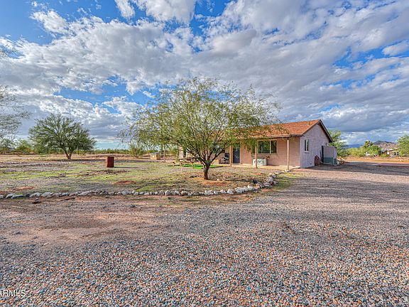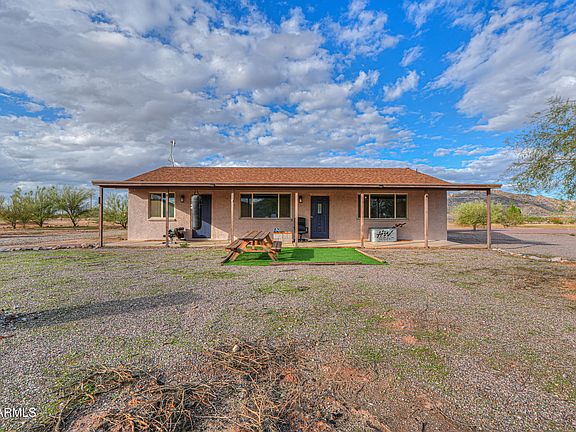 USDA ELIGIBLE! This SITE BUILT beauty sits on nearly 5 level acres in Hidden Valley & has tons of room for horses or toys! This gorgeous MOVE-IN READY home boasts nearly 1500 sq ft & is loaded with upgrades- porcelain tile flooring throughout, neutral two toned paint inside & out, full covered patio & more! Featuring entertainers kitchen with Oak cabinetry, all appliances, 3 spacious bedrooms, 2 full baths with upgraded vanities, jacuzzi tub in primary bath & open concept floor plan with palatial great room! Split master boasts ensuite bath with walk-in shower & large closet! FULLY FENCED lot features desert landscaping, gravel driveways, 45x36 concrete slab, storage sheds, no HOA, shared well & just off paved roads with GORGEOUS MOUNTAIN VIEWS & close to CG & Maricopa! TRULY A MUST SEE!
