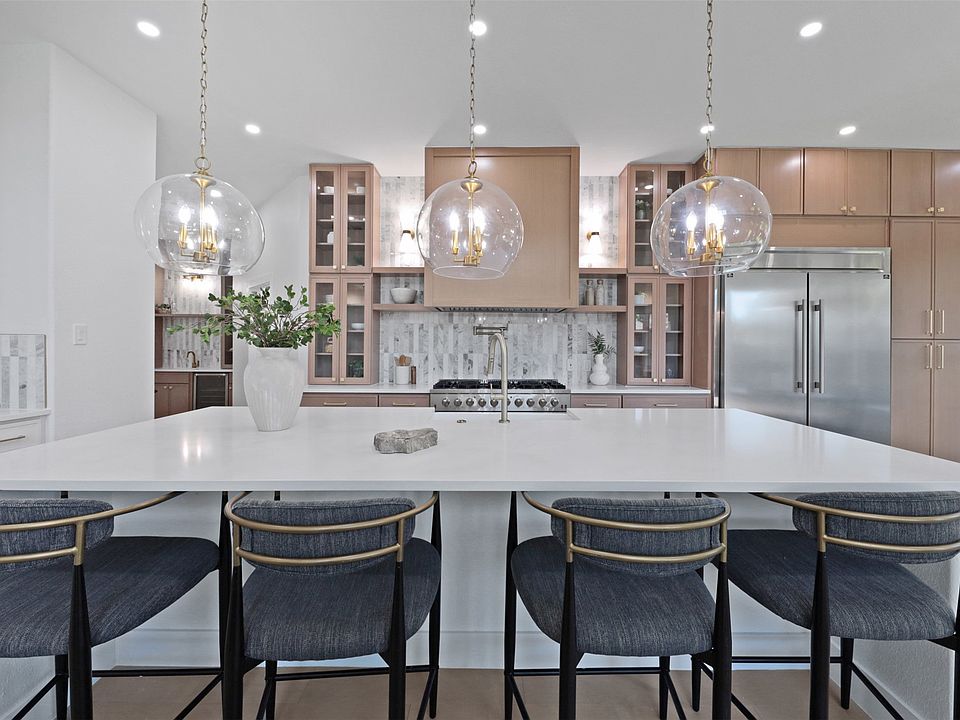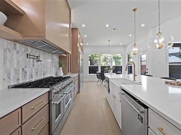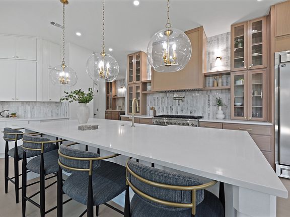 Step inside to find engineered hardwood floors throughout, a tandem 3-car garage, and a secure electric driveway gate. The heart of the home is the chef’s kitchen, boasting quartz countertops, an oversized waterfall island, gas range, walk-in pantry, and custom finishes throughout.