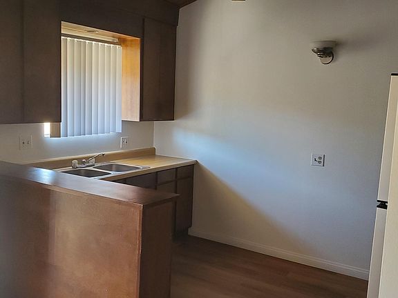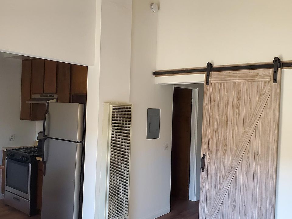 Cute junior one bedroom apartment available. Unit has beautiful laminate flooring, wood vaulted ceilings, a new barn door that separates the living room from the bedroom, and blinds throughout. Kitchen comes with a stainless steel stove and fridge, and is spacious enough for a small table and chairs. Unit is located at the rear of the complex above the carports, and comes with one assigned parking space. Property is 31 units, has a laundry room, and is very close to the beach, Farmer's Market, banks, shopping, restaurants, and easy access to freeways. Pets are okay, but NO smoking. Landlords pay for water, trash, and landscaping. Please call AFTER 9 a.m. and BEFORE 9 p.m., as this is a cell phone. Lease is for a minimum of 12 months. Landlords pay for water, trash, and landscaping. Pets are okay, but NO smoking. One parking space is included.