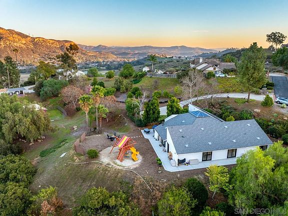 Stunning 3,356 Sq. Ft. mountain-View Estate on 2 usable acres in the highly sought-after Eucalyptus Hills community. This custom home offers mountain views & an abundance of space—inside and out. Ample parking for RVs, boats, & trailers, & an EV charger. An owned solar system adds energy efficiency & cost savings! Inside, the remodeled kitchen is a showstopper. With a spacious center island, skylight, & ample counter space perfect for cooking, entertaining, & gathering. The main living spaces offer an open concept living area with a wood vaulted ceiling, skylight, new tile flooring and a mini bar. The family room features a cozy wood-burning stove & seamlessly extends to the expansive backyard, providing indoor-outdoor flow with stunning views. In the primary suite, a walk-in closet, sliding doors leading to the yard, & a luxurious, remodeled en-suite bath with a soaking tub provide the perfect place for relaxation. Additional living spaces include a flexible office space, two generously sized bedrooms, & an oversized fourth bedroom. This property boasts 14 fruit trees—including apple, plum, and avocado—alongside a spacious storage shed to accommodate all your gardening essentials. A well-equipped 4-stall barn provides the perfect setup for your horses or 4-H projects, complete with a dedicated tack room, office, or flexible storage space. Offering a rare opportunity to embrace peaceful country living while remaining conveniently close to the city, this exceptional home is a must-see!
