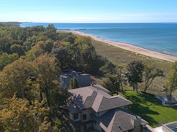 Perched along the shores of Lake Michigan within the exclusive Riviera Association, this 5-bed, 5.5 bath home epitomizes the elegance & timelessness of Lakefront contemporary architecture. Designed in 2013 by the renowned architects Perkins, Pryde & Kennedy & completed in 2015, this 5,000+ sq ft home masterfully represents a modified Prairie Style design full of modern luxury & stunning natural surroundings. Exquisite hardwood floors infuse warmth into every room. Expansive glass walls offer panoramic views of Lake Michigan, seamlessly connecting the indoor & outdoor spaces. The open and light-filled design allows residents to fully immerse themselves in the tranquil landscape. Featuring five spacious bedrooms and five and a half beautifully appointed baths. Each ensuite bedroom is thoughtfully designed to provide comfort & a sense of serenity. The living areas are characterized by their openness, flooded with natural light, and offering breathtaking vistas of the lake. Enjoy the all-level elevator for convenience; private lakefront office; lush green lawn with plenty of room for a pool; spacious decks; Elan Smart Home system; beach cabana for relaxing by the shore & easy access to the private association beach via a low bluff. For the discerning buyer who desires more than just a home, this work of art captures the essence of Lakefront Contemporary design while offering modern luxury.