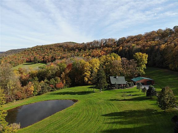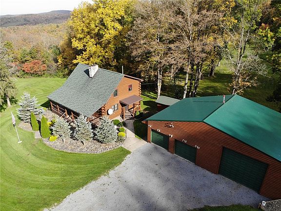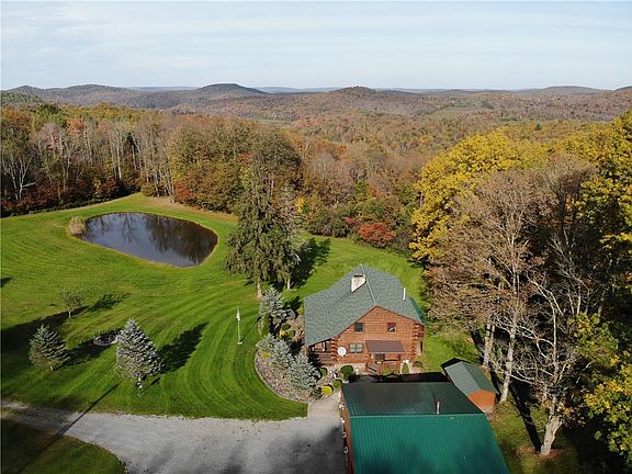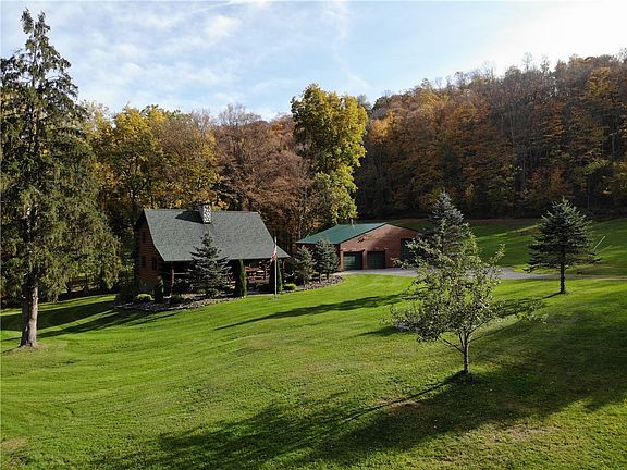 When you think of a picturesque log home in the mountains, this is the place we all dream of! This very private 30 acre parcel bordering State Game Lands has a custom built log home nestled perfectly in the mountainside overlooking a pond stocked with bass, bluegills, and koi. This 3 bed, 2.5 bath home has central air and forced hot air plus a pellet stove capable of heating the entire home. 1st floor has an open floor plan with a cathedral ceiling living room, kitchen, dining area, bedroom and full bath with shower and included stackable laundry unit. 2nd floor has 2 bedrooms and full bath with a clawfoot tub. The loft area on the 2nd floor is currently used as another sleeping area. Plenty of storage space in the basement and detached garage. Sit back and relax and take in the view on the ample front porch. Two strong springs, with a professionally done setup, is providing water to this property as it has been doing for many years. Please give me a call today to schedule a showing!