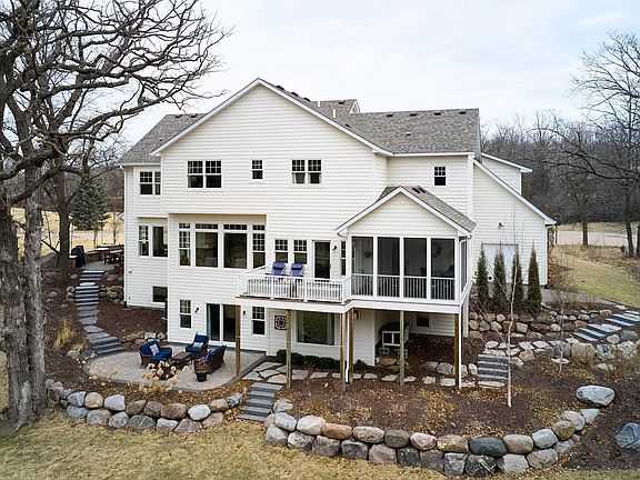 Inside, the main level welcomes you with a two-story foyer, a grand staircase and a secondary staircase. The home offers elegant formal and informal dining areas, a gourmet kitchen thoughtfully designed with high-end finishes, and a spacious family room with a stone-surround gas fireplace. A three-season screened porch and an inviting deck provide views of the wooded landscape. The main floor also boasts a generous office, a four-season porch with access to a paver patio and firepit, a mudroom, and an oversized three-car garage.