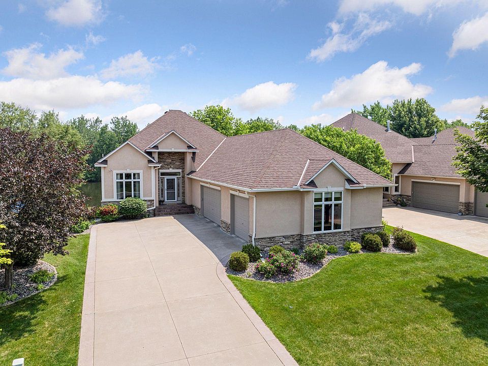 Don’t miss this rare opportunity to enjoy your own private beach on Sunrise Lake! This one-owner, custom Gorham-built walkout rambler is meticulously maintained and features vaulted ceilings, rounded corners, and an open kitchen with new cooktop, newer dishwasher, and abundant storage. A main-floor den offers custom built-ins, while the primary suite includes a heated bath floor. Relax on the maintenance-free deck or in the walkout lower-level family room with fireplace, wet bar, flex space, and patio. The oversized heated 3-car garage has room for vehicles, storage, and toys. Outdoors, enjoy your private shoreline patio, sand play area, and nearby trails. Sunrise Lake spans 155 acres with six miles of scenic shoreline, four pedestrian bridges, and a public beach with splash pad, boathouse, volleyball, and playground. Lakeside living at its finest — year-round!
