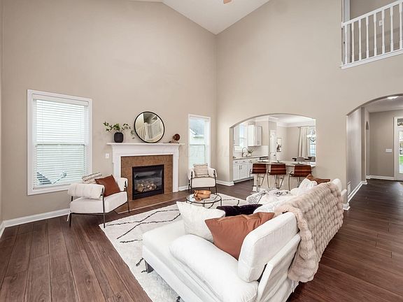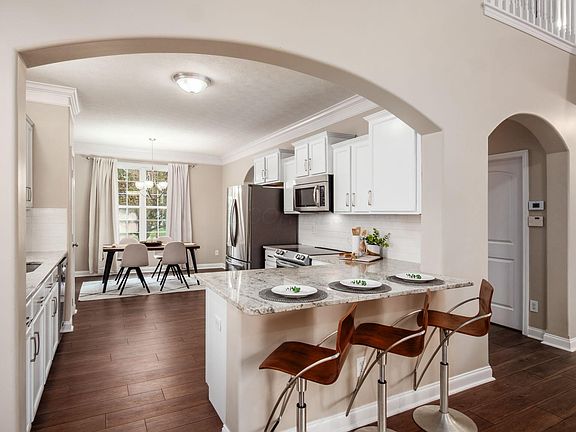 The main level features luxury vinyl plank flooring, an open kitchen with 42'' cabinets, granite countertops, stainless steel appliances, a pantry, a peninsula with an eat-in kitchen bar, and a large dining area. The kitchen flows seamlessly into the impressive two-story great room with beautiful views of the patio and backyard.