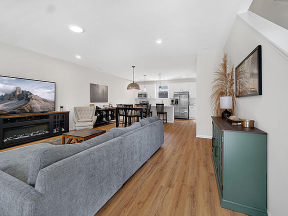 Welcome to your move-in ready Wyatt townhome in Walkerton Park offering low-maintenance living and modern features throughout. The main floor features an open-concept layout with 9' ceilings, luxury vinyl plank flooring, integrated LED lighting, and a spacious kitchen with 42" white maple soft-close cabinets, quartz countertops, a large island with seating overhang, stainless steel GE appliances including a refrigerator, and a 5' pantry for extra storage. Just off the kitchen is a private, fenced-in patio that leads to an oversized 2-car garage. Upstairs you'll find two spacious bedrooms, including an owner's suite with a walk-in closet, a full bath, and a laundry area with an included GE washer and gas dryer. This energy-efficient home also comes equipped with smart home technology, a Ring doorbell, full yard landscaping with irrigation, and a covered front porch.
