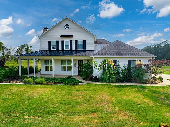 Discover this 3119 sq. ft. custom farmhouse-style home built by Harris Building Company, perfectly situated on 44+ acres in the rolling hills and trees of East Texas. Enter the electric gate and drive toward this thoughtfully designed home with welcoming front porch. Step inside to find an inviting open living area with fireplace, dining area and a well-appointed kitchen featuring a large island with stained wood counter, marble counters, farmhouse sink, premium appliances, generous built-in cabinetry & pantry. Window treatments and wood shiplap accent walls throughout the home add warmth and timeless character. The light filled primary bedroom, located downstairs, has spa bath including soaking tub, shower, separate custom sinks, walk-in closet and tile flooring providing privacy and comfort. Spacious guest bedrooms and inviting guest bath are located upstairs. Outdoors, you’ll find a 40' x 30' barn with concrete floor and two dirt runs, ideal for livestock or equipment. A whole-house generator with 1000-gallon propane tank provides peace of mind in any weather. Enjoy serene views from the covered back patio overlooking open pastures and the surrounding countryside. A pond provides access to water for livestock. The property is fully fenced with an electric entrance gate for privacy and security. A rare combination of craftsmanship, functionality, and natural beauty—this property offers the best of East Texas country living.