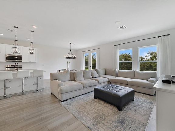Skip the Wait, Own a Like-New 5-Bedroom Home Today! Why wait for new construction when you can move into this barely lived-in 5-bedroom, 3-bath home with a 2-car garage right away? Nestled in the sought-after Hampton Lakes community with a low HOA, this stunning home offers modern elegance and spacious living. Step inside to find beautiful wood-look tile flooring throughout the main living areas, leading you into the open-concept family room and thoughtfully designed kitchen. The heart of the home, this chef’s kitchen features handsome quartz countertops, a large center island, 42” cabinets, stainless steel appliances, a closet pantry, and ample cabinet and counter space. Overlooking the perfectly appointed dinette area, the kitchen also provides French door access to the expansive backyard, ideal for entertaining or relaxing. The primary ensuite is a private retreat, boasting tray ceilings, abundant natural light, dual sinks with an extended vanity, a glass-enclosed shower, and a spacious walk-in closet. Just outside the primary bedroom, a huge loft/flex space serves as a perfect playroom, media area, or second living room for the family. Bedrooms three and four each feature walk-in closets and share a well-appointed hall bath. Downstairs, a guest bedroom and full bath provide an ideal setup for in-laws or visiting guests. Located in an ideal spot with easy access to I-4 via Saxon Blvd, this home is just minutes from local shopping, dining, parks, and scenic lakes.