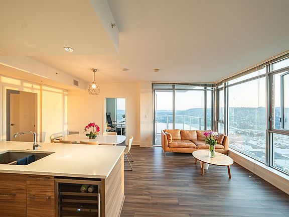 Welcome to M3 by Cressey, Coquitlam's tallest and most sought-after tower. This 2bed/2bath home also includes a spacious den with a large window, easily used as a third bedroom. The southwest-facing corner layout, 9' ceilings, floor-to-ceiling windows, air conditioning, and an efficient floorplan designed for modern living. The signature CresseyKitchen is equipped with Blomberg & Fulgor Milano appliances, double refrigerators, and a wine cooler. Enjoy sweeping, unobstructed views from every room. The primary suite features a spa-inspired ensuite with radiant heated flooring. Exclusive access to the Summit Club on the 47th & 48th floors, offering 9,000 SF of world-class amenities including gym, lounge and entertainment spaces. Just steps to Coquitlam Centre, SkyTrain, Lafarge Lake and more.