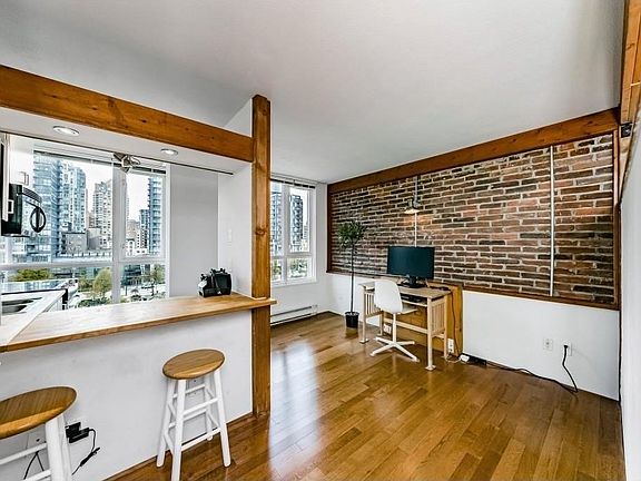 This fantastic Yaletown studio features west views, over Emery Barnes and converted to have the look of a loft, with exposed brick in the living room area, and wood and beam separating a sleeping nook. With some upgrades, the kitchen has been opened up to bring in more natural light with ample of closet space, and the countertop has also been renovated.