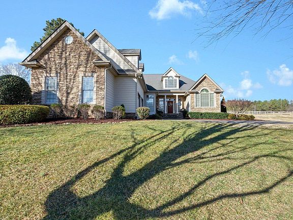 TIGERVILLE HORSE FARM with an AMAZING MOUNTAIN VIEW! Located on 5.69 acres the property features an ARENA, PASTURE, 4 STALL BARN with hot and cold wash rack, paddock, feed bins, hay loft and some mats. The CUSTOM BUILT HOME boasts STONE AND HARDI EXTERIOR. Inside you will find a 2 story foyer, open living room with VAULTED CEILING and STONE FIREPLACE. HARDWOOD FLOORS THROUGH MAIN LIVING AREA. The kitchen over looks the living area and is the HUB of entertainment. Formal dining room with trey ceiling, breakfast room, stainless steel appliances and granite counters. The primary bedroom features door to deck, dual vanities, walk-in closet, separate shower and garden tub. With a split bedroom floor plan, everyone has their own space. Flex room above the garage is perfect for exercise or media room. Large laundry room with sink and folding table. Fenced back area for your fur babies. This home just “feels good”.