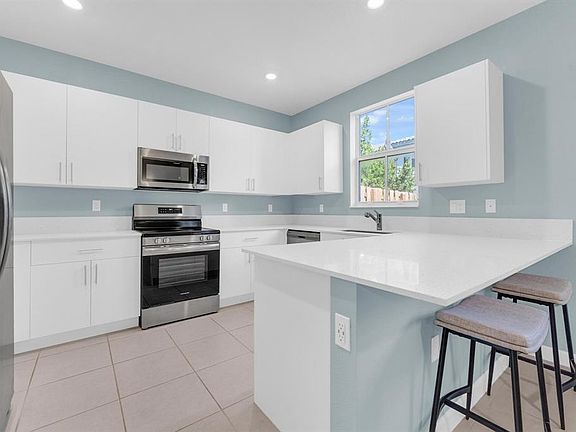 Breakfast barQuartz countersCustom cabinetryModern kitchenNeutral tile floorsPrivate fenced in backyardStainless steel appliances