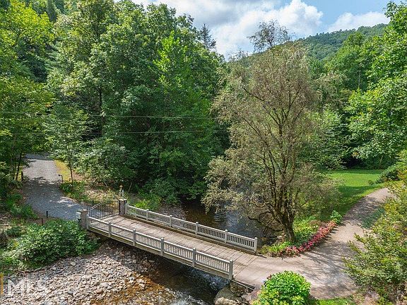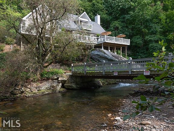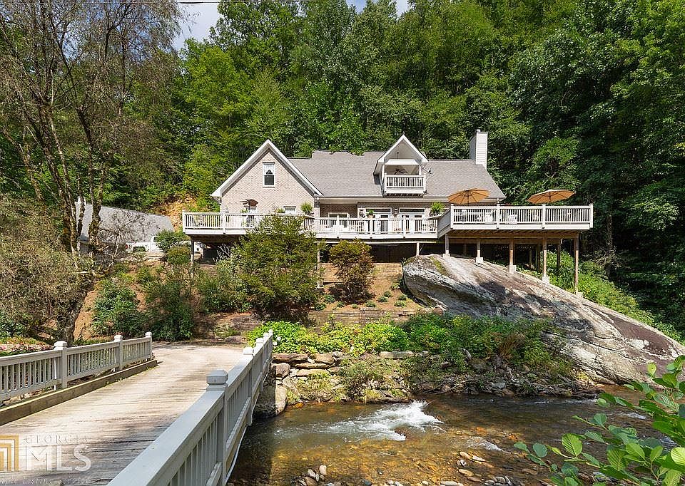 Tate City! Sitting atop a dramatic boulder overlooking the Tallulah River, this 3Bd, 2.5ba home boasts a 79 ft. deck offering the perfect spot for enjoying the river. An electric gate and bridge over the 250 ft. of private river frontage protect the property from unwanted guests. The custom built home boasts a great room with open chef's kitchen featuring a 6 burner Wolf gas range and double ovens, 2 Bosch dishwashers, a Sub Zero refrigerator, and granite countertops. The master suite on the main floor has its's own fireplace and elegant master bath with tub and separate shower. Additional features include 2 bedrooms upstairs with Jack-n-Jill bathroom, reclaimed pine floors, a 1 car attached garage, a 2 car detached garage with storage, and a generator.