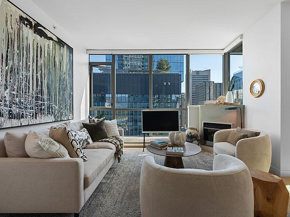 Welcome to The Melville, one of Coal Harbour's most prestigious addresses. This stunning 1 Bed+ Den home boasts views of the city, mountains & ocean from floor-to-ceiling windows with 9' ceilings. Recent upgrades include quartz counters & backsplash, Blanco Silgranit sink, designer lighting, concrete fireplace, power blinds & hardwood floors. The versatile den works perfectly as a home office or junior bedroom, offering flexibility for today's lifestyle. Thoughtfully updated throughout, this home blends modem comfort with timeless style. Enjoy world-class amenities: rooftop pool & hot tub, gym, sauna, Peloton & yoga rooms, 24-hr concierge, gardens & more. Pet-friendly (2 pets, no size restrictions). Steps to the seawall, dining & shopping, this is Coal Harbour living at its finest.