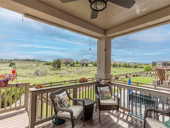 Idyllwilde Ranch Home with spectacular open space views! This 2019-built Toll Brothers home boasts modern finishes and conveniences. When you walk through the front door, you will see the stunning views of the open space behind with rolling hills and beautiful pine trees. This is truly one of the most spectacular open space views in the neighborhood! The upgraded gourmet kitchen has under-cabinet lighting, a gorgeous tile backsplash, eat-at island, upgraded Jenn-Air stainless steel appliances, including a 6-burner gas stove and a built-in refrigerator. Additional upgrades include new high-end LVP flooring, plantation shutters with blackouts, added laundry room cabinets, crown moldings, 10’ ceilings, 8’ doors, new carpet, and a central vac system. The open floorplan is perfect for entertaining friends, and the dining room can accommodate the largest of dining room tables. The spacious master suite has a coffered ceiling, crown moldings, and open space views! Beautiful tile, a frameless glass shower, and gorgeous cabinetry combine to create a stunning 5-piece master bath, including a large walk-in closet. The guest bath is nicely appointed with gorgeous tile and cabinetry. The large main floor study can accommodate all of your work-from-home needs. Spend countless hours on the covered back deck enjoying the stunning open space views! The low-maintenance yard boasts high-end artificial turf, minimizing your time maintaining the yard. The French doors leading to the rear deck open allowing you to create a seamless indoor/outdoor space. The brand-new finished basement boasts another 2100 square feet and has a large great room, 2 bedrooms, a workout room, and a beautiful wet bar area with bar fridge and microwave and a large storage area. The full-size windows and garden-level views in the basement create a space that is bright and airy. The 3-car garage is fully insulated, has new epoxy floors, a car charging station, and has space for all your toys! WELCOME HOME!