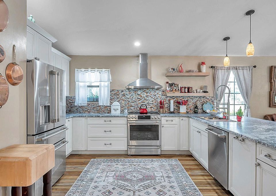 This BEAUTIFUL HOME located in the lovely, DESIRABLE, Blue Cove subdivision has been completely remodeled: drywall, top of the line 21 mil. vinyl plank flooring (no scratches by dog nails or furniture when moved), chimney re-stuccoed, new roof on the home and on the extra two car garage. Remote controlled ceiling fans in all rooms and light fixtures. Gutters have metal gutter guards. The kitchen cabinets are Kraft-maid soft close, with two lazy suzan's (gone are the 80's pink cabinets). The kitchen counter top is Brushed Montana Gray granite that feels like leather (does not show fingerprints) and has a rough cut edge. Large stainless steel sink. Stainless steel appliances are all GE CAFE, (top of the line) refrigerator and stove connect to the internet. You can run the stove by the app for a preheat etc. It is convection and air fry. The tile backsplash in the kitchen matches the tile on the working wood burning fireplace. The mantel is reclaimed from an old barn in South Dakota. The bathrooms have new tile flooring and jacuzzi shower systems with rain fall shower heads, teak seats, handhelds, and glass doors. All the rooms have barn doors except for the third bedroom. The original solid wood doors are in the second garage and stay with the home. The laundry room has Samsung washer and dryer on pedestals , a dog wash station (if you do not want the station the laundry room sink is in the second garage and can be reinstalled). This beautiful home has an open floor plan. The pool is large and has an 8 foot deep end, and has an automatic fill system. The bird cage was re-screened in 2023 and a doggy door was added. The whole back yard is fenced with privacy fence to keep your kids and pets safe at all times. The back yard has two large gates on each side if you want to park a motorhome in the side yard. The back yard has a lemon, grapefruit, and orange tree, and is landscaped. In the courtyard between both garages there is a seating area with a small koi pond (no fish the birds like them way to much) , sweet viburnum that will eventually grow into a hedge for privacy plus various plants. The extra two car garage has a full bathroom, it was NOT remodeled, it is currently used for storage. This garage could be converted into a mother in law suite or a rental (air-b-n-b are allowed). New landscaping that includes 8 loquat trees, banana plants (they will grow bananas). This beautiful home is only a two minute walk from the Rainbow river via the community park right behind the house. The association fees to use the park are only $100.00 a year and that is optional. No join, no park. Property taxes are less than properties on the river (those can go from $25,000.00 a year or higher, homesteaded) if homestead property the taxes are aprox. $3,000.00, no homestead then aprox. $6,000.00. Everyone wants on the river that is a given but those homes start at One Million dollars and up have high taxes and require flood insurance, this wonderful home does not. Plus when the river is in full swing and full of tubers and boaters you can stay home and enjoy your pool without the hassle of tubing or boating season. As you can see from the photos there is a family of sandhill cranes that love to visit daily, of course leaving them food makes them really happy. This beautiful home may not be on the river, but you are just steps away from access and the home is NOT in a flood zone. This home is turn key, no repairs needed. If you do not wish to cook, just walk out of the subdivision, turn to your left, walk down the sidewalk and enjoy Swampy's on the river. This beautiful home is ready for you and your family, or for an Air-B-N-B.