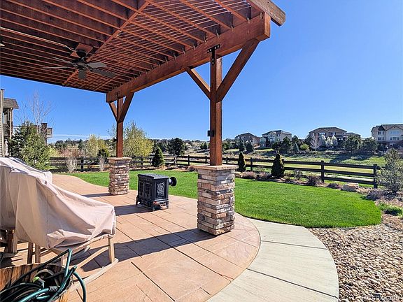 Step into luxury the moment you walk through the front door of this breathtaking home, where soaring 21-foot ceilings and a striking stone fireplace set the tone for an impressive main level. Perfectly positioned on a coveted corner lot with no rear neighbors, this home delivers the space, style, and serenity you’ve been searching for. The heart of the home is the gourmet kitchen featuring upgraded stainless steel appliances, a 5-burner gas cooktop, double ovens, a spacious granite island with bar seating, a butler’s pantry, and seamless flow into the family room. The main floor primary suite is a private retreat, offering crown molding, a tray ceiling, built-in sound system, and a spa-inspired 5-piece bath with a sunken tub and walk-in closet. Enjoy your morning coffee on your private balcony, a rare and peaceful feature that sets this home apart. Also on the main level: a secluded home office perfect for working remotely. Upstairs, you’ll find three spacious bedrooms, two connected by a Jack-and-Jill bath, the third with its own en-suite and a bright, versatile loft that works as a second living area or flex space. Step outside to the beautifully landscaped backyard, where open space and mature trees provide a peaceful setting for relaxation or play. The walk-out basement is full of potential, finish it for extra space or use for storage. Located in the sought-after Idyllwilde community, residents enjoy amenities including the Fika Coffee House, clubhouse, fitness center, pool, and scenic walking trails. All just minutes from top-rated Douglas County schools, downtown Parker, shopping, dining, and major highways. This move-in ready home offers the perfect blend of comfort, quality, and location, schedule your showing today!