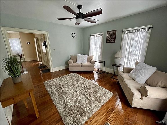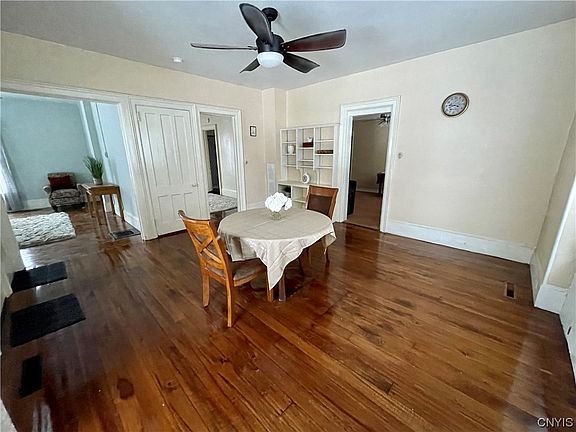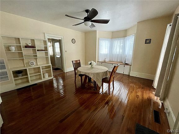 Looking for a village home with a large backyard? Welcome to this 4 bedroom, 2 bath charming home in the Village of Wolcott featuring gleaming refinished hardwood floors. Step onto the southern style front porch large enough for outdoor living in warmer weather. As you enter the front door you will walk into a grand dining room that is perfect for entertaining! Appreciate the bench style bay window with storage that would make a great reading spot. A large eat in kitchen along with a spacious living room make up just part of the first floor. There is also a bonus room perfect for hobbies, toys or a quiet sitting room. Hardwood steps lead you up to 4 spacious bedrooms. The main bedroom has a bump out window allowing more natural light to filter into the room. The second bedroom has built in storage creating more open space for furniture. Two additional bedrooms are separated by a built-in desk perfect for working, studying or video meetings. The double lot offers tons of potential for all your outdoor living needs.